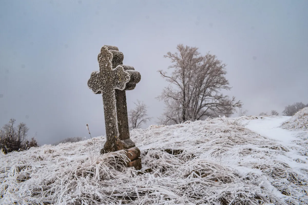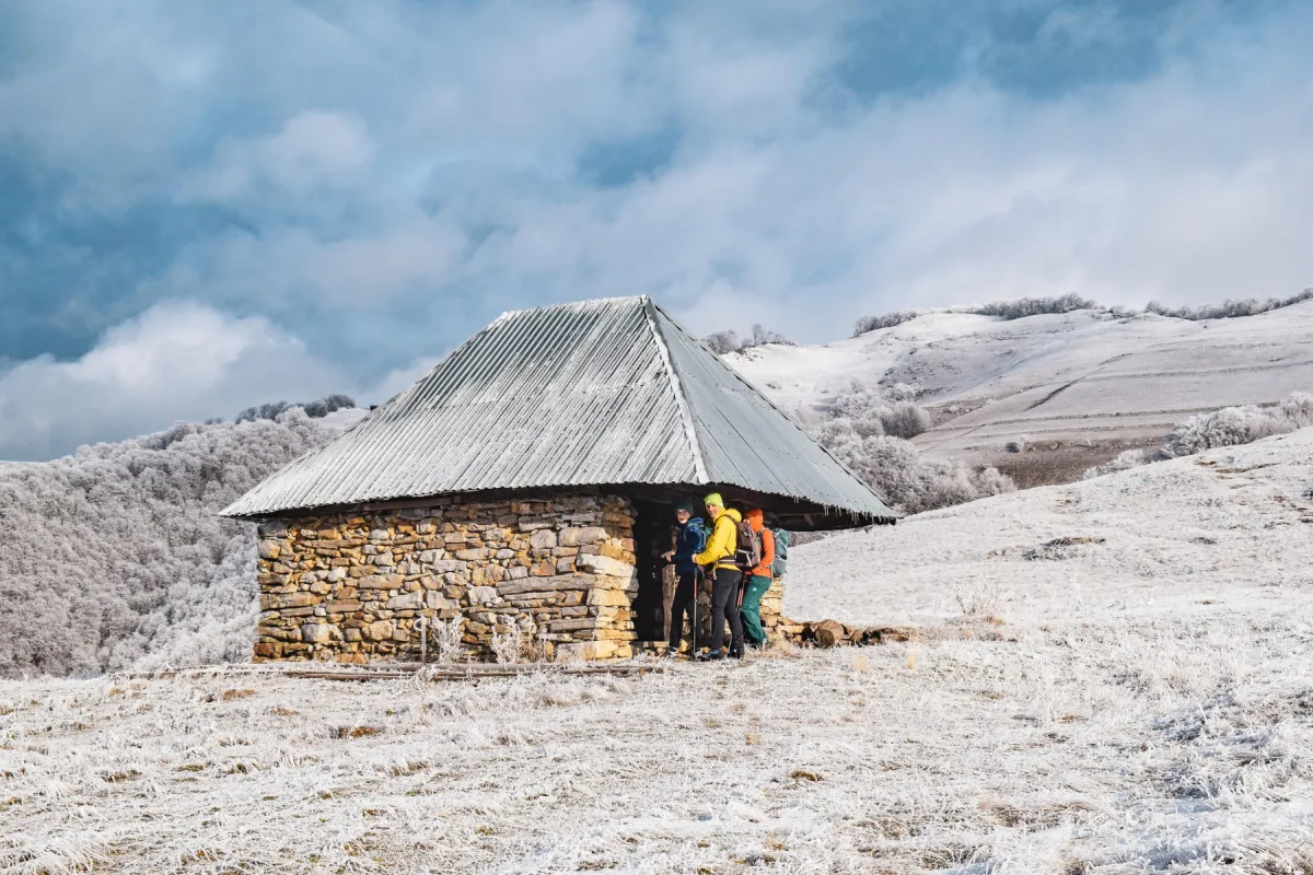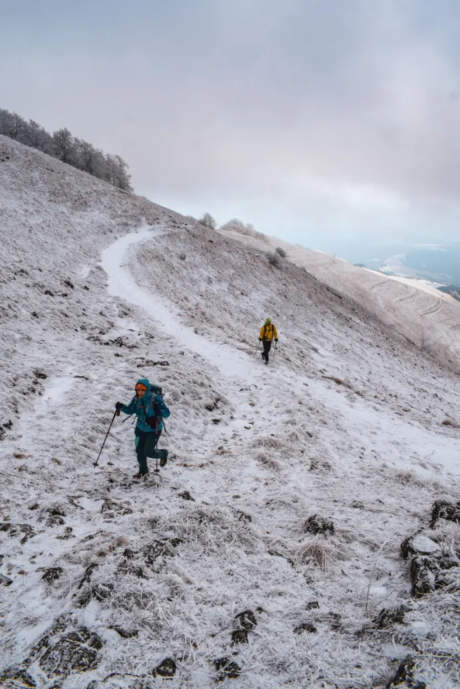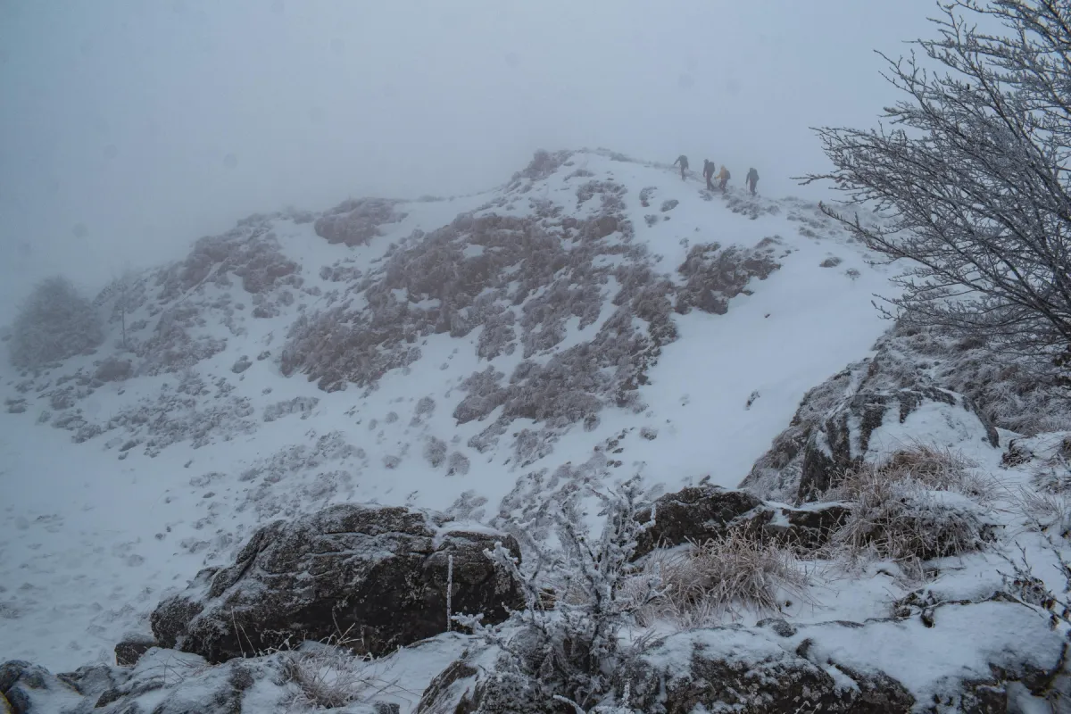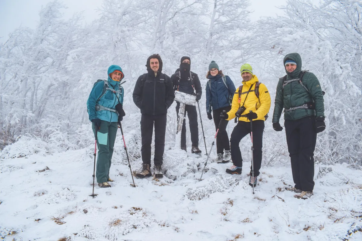 În timp ce ne apropiem de platoul de sub vf. Dâmbău, norii se răspândesc printre pietrele de calcar ce astăzi stau înzăpezite. Bâjbâim cumva urcarea pe vârf, unde nu zăbovim prea mult din pricina vântului care ne tot dă de furcă. Facem o poză de grup, iar apoi ne întoarcem până la intersecția cu marcajul PR, pe care îl urmăm până spre refugiul Săruni, unde ne adăpostim în filigoria denumită foarte sugestiv „făgădăul Săruni” pentru a face o scurtă pauză de masă.