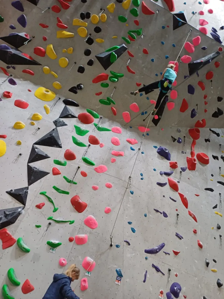 După cel mult o oră și jumătate pe drum am ajuns la sala de escaladă Blokx la ora deschiderii (10:00). Sala ne-a impresionat plăcut pe mulți dintre noi: de la curățenie, la diversitatea traseelor (bouldering/escaladă), kilter board, trasee cu autobelay, temperatura și atmosfera plăcută.